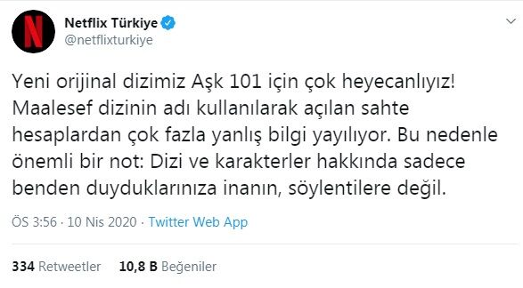 Netflix Türkiye, açıklamasında; 'Yeni orijinal dizimiz Aşk 101 için çok heyecanlıyız! Maalesef dizinin adı kullanılarak açılan sahte hesaplardan çok fazla yanlış bilgi yayılıyor. Bu nedenle önemli bir not: Dizi ve karakterler hakkında sadece benden duyduklarınıza inanın, söylentilere değil' ifadelerine yer verdi.